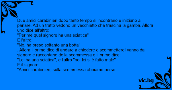 Due amici carabinieri dopo tanto tempo si incontrano e iniziano a parlare. Ad un tratto vedono un vecchietto che trascina la gamba. Allora uno dice all'altro: