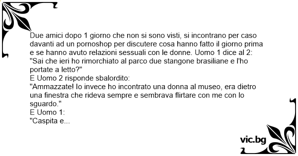 Due amici dopo 1 giorno che non si sono visti, si incontrano per caso davanti ad un pornoshop per discutere cosa hanno fatto il giorno prima e se hanno avuto relazioni sessuali соn le donne. Uomo 1 dice al 2: