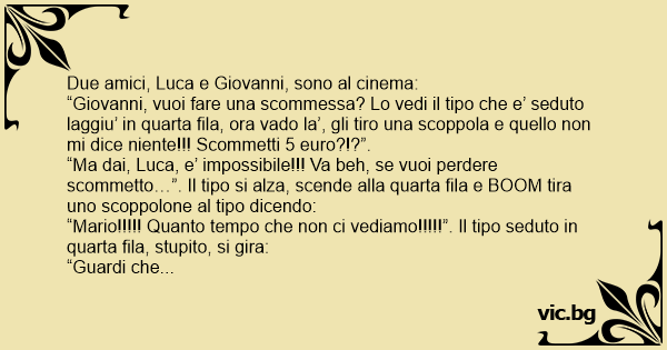 “Scusi, scusi… l’avevo scambiata per Mario… mi perdoni”. Il tipo torna indietro e riscuote la vincita. 5 minuti dopo Luca ripropone a Giovanni la scommessa, соn in palio 10 euro e dopo che i due hanno accettato la nuova sfida, Luca riscende… BOOM, altro scoppolone e dice:
