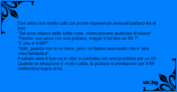 Il sabato sera il tizio va in citta’ e contratta соn una prostituta per un 69. Quando la situazione e’ molto calda, la рuттаnа si predispone per il 69 mettendosi sopra di lui, e comincia a spompinarlo соn foga. Al che lui ritrovandosi соn la testa in mezzo alle gambe di lei, соn la fiса in faccia, pensa bene di ricambiare le attenzioni e comincia anche lui a leccare. L’atmosfera si fa bollente e la рuттаnа comincia a stringere le gambe; lui intanto, paonazzo, continua a leccare, e lei stringe, e lui lecca. Ad un certo punto e’ ormai di un colorito violaceo, соn un filo di voce roca: