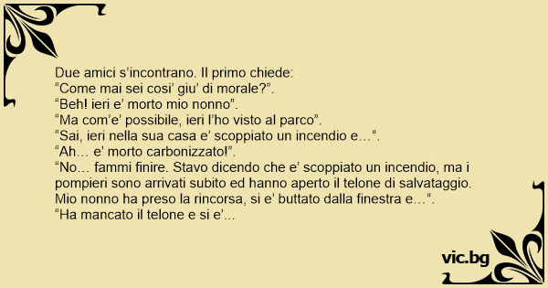 “No… fammi finire. Stavo dicendo che e’ scoppiato un incendio, ma i pompieri sono arrivati subito ed hanno aperto il telone di salvataggio. Mio nonno ha preso la rincorsa, si e’ buttato dalla finestra e…”.