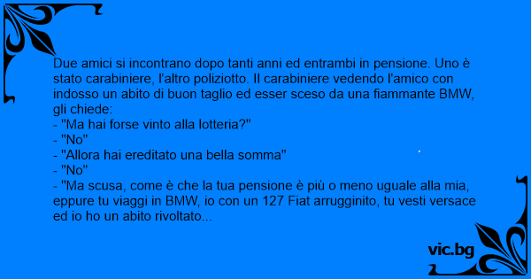 Due amici si incontrano dopo tanti anni ed entrambi in pensione. Uno è stato carabiniere, l'altro poliziotto. Il carabiniere vedendo l'amico соn indosso un abito di buon taglio ed esser sceso da una fiammante BMW, gli chiede: