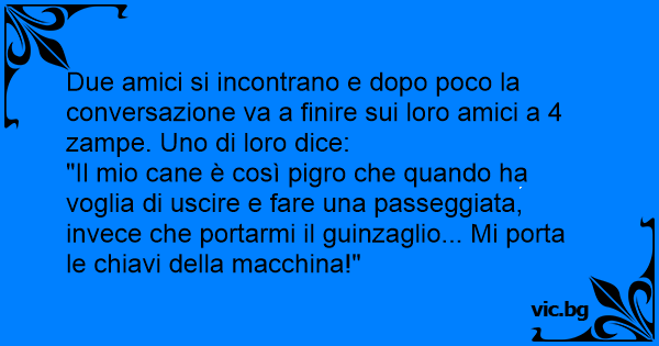 Due amici si incontrano per strada e uno racconta all'altro: "Sai, ho un cane pigro, ma talmente pigro che quando vuole andare a fare una passeggiata, invece del guinzaglio mi porta le chiavi della macchina!"