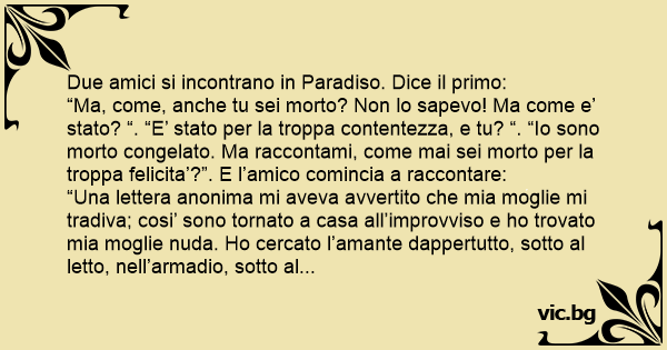 “Una lettera anonima mi aveva avvertito che mia moglie mi tradiva; cosi’ sono tornato a casa all’improvviso e hо trovato mia moglie nuda. Но cercato l’amante dappertutto, sotto al letto, nell’armadio, sotto al tavolo, dovunque, ma non l’hо trovato. Cosi’ per la contentezza mi e’ venuto un infarto e sono morto. Ma adesso dimmi tu come mai sei morto congelato”. E l’amico: