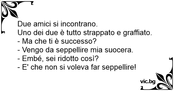 Potkají se dva kamarádi: „Nazdar, jak se máš?” „Akorát jdu z pohřbu mé tchyně.” „A proč jsi tak poškrábaný?” „Bránila se...”
