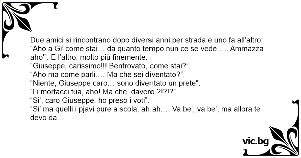 “Si’ ma quelli i pjavi pure a scola, ah ah…. Va be’, va be’, ma allora te devo da fa’ ‘n regalo! Annamo li’, che c’e’ un negozio de robba pe’ preti”. Si avvicinano al negozio e Giuseppe: