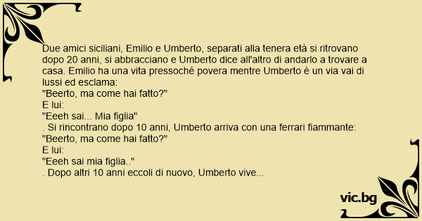 Due amici siciliani, Emilio e Umberto, separati alla tenera età si ritrovano dopo 20 anni, si abbracciano e Umberto dice all'altro di andarlo a trovare a casa. Emilio ha una vita pressoché povera mentre Umberto è un via vai di lussi ed esclama:
