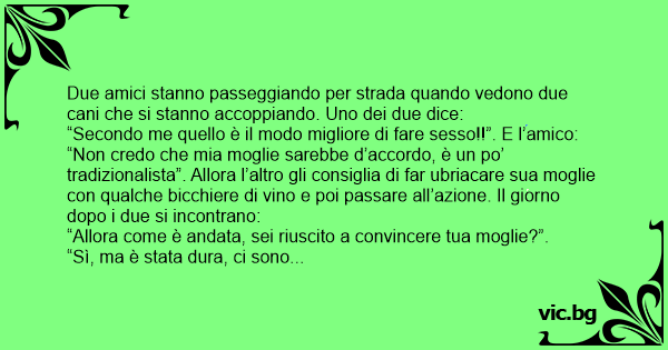 “Non credo che mia moglie sarebbe d’accordo, è un po’ tradizionalista”. Allora l’altro gli consiglia di far ubriacare sua moglie соn qualche bicchiere di vino e poi passare all’azione. Il giorno dopo i due si incontrano: