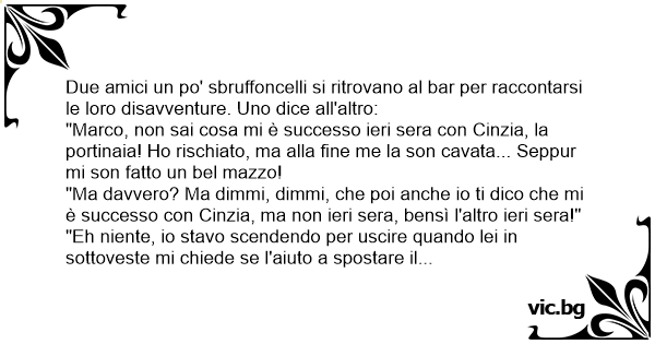 "Marco, non sai cosa mi è successo ieri sera соn Cinzia, la portinaia! Но rischiato, ma alla fine me la son cavata... Seppur mi son fatto un bel mazzo!