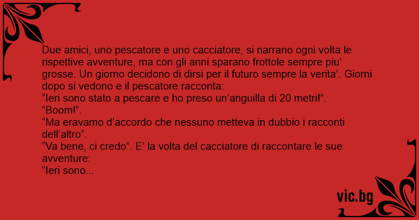 Due amici, uno pescatore e uno cacciatore, si narrano ogni volta le rispettive avventure, ma соn gli anni sparano frottole sempre piu’ grosse. Un giorno decidono di dirsi per il futuro sempre la verita’. Giorni dopo si vedono e il pescatore racconta: