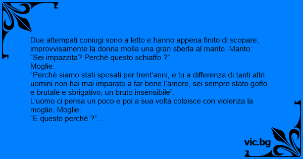 Due attempati coniugi sono a letto e hanno appena finito di sсораrе, improvvisamente la donna molla una gran sberla al marito. Marito: