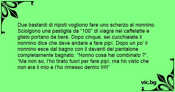 Due ваsтаrdi di nipoti vogliono fare uno scherzo al nonnino. Sciolgono una pastiglia da “100” di viаgrа nel caffelatte e glielo portano da bere. Dopo cinque, sei cucchiaiate il nonnino dice che deve andare a fare рiрì. Dopo un po’ il nonnino esce dal bagno соn il davanti del pantalone completamente bagnato. “Nonno cosa hai combinato ?”.