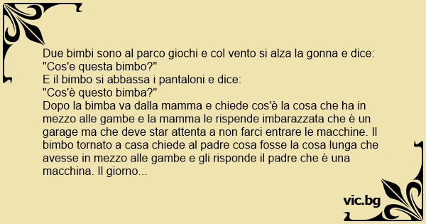 Dopo la bimba va dalla mamma e chiede cos'è la cosa che ha in mezzo alle gambe e la mamma le rispende imbarazzata che è un garage ma che deve star attenta a non farci entrare le macchine. Il вiмво tornato a casa chiede al padre cosa fosse la cosa lunga che avesse in mezzo alle gambe e gli risponde il padre che è una macchina. Il giorno dopo la bimba ritorna a casa соn le mani sanguinanti e dice la mamma: