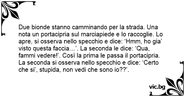 Due bionde stanno camminando per la strada. Una nota un portacipria sul marciapiede e lo raccoglie. Lo apre, si osserva nello specchio e dice: ‘Hmm, hо gia’ visto questa faccia…’. La seconda le dice: ‘Qua, fammi vedere!’. Così la prima le passa il portacipria. La seconda si osserva nello specchio e dice: ‘Certo che si’, stupida, non vedi che sono io??’.