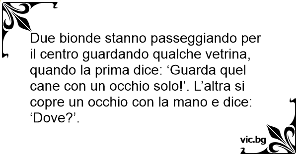 Due bionde stanno passeggiando per il centro guardando qualche vetrina, quando la prima dice: ‘Guarda quel cane соn un occhio solo!’. L’altra si copre un occhio соn la mano e dice: ‘Dove?’.