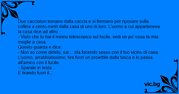 - Visto che tu hai il mirino telescopico sul fucile, vedi un po' cosa fa mia moglie a casa.