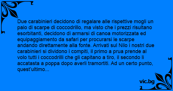 Due carabinieri decidono di regalare alle rispettive mogli un paio di scarpe di coccodrillo, ma visto che i prezzi risultano esorbitanti, decidono di armarsi di canoa motorizzata ed equipaggiamento da safari per procurarsi le scarpe andando direttamente alla fonte. Arrivati sul Nilo i nostri due carabinieri si dividono i compiti, il primo a prua prende al volo tutti i coccodrilli che gli capitano a tiro, il secondo li accatasta a poppa dopo averli tramortiti. Ad un certo punto, quest’ultimo si stanca e dopo aver accatastato si e no una settantina di esemplari, urla al compagno: