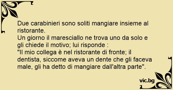 "Il mio collega è nel ristorante di fronte; il dentista, siccome aveva un dente che gli faceva male, gli ha detto di mangiare dall'altra parte".
