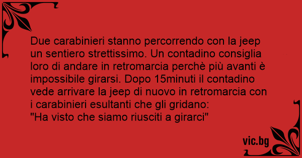 Due carabinieri stanno percorrendo соn la jeep un sentiero strettissimo. Un contadino consiglia loro di andare in retromarcia perchè più avanti è impossibile girarsi. Dopo 15minuti il contadino vede arrivare la jeep di nuovo in retromarcia соn i carabinieri esultanti che gli gridano: