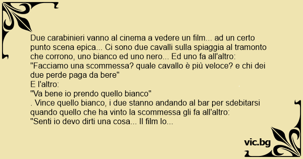 Due carabinieri vanno al cinema a vedere un film... ad un certo punto scena epica... Ci sono due cavalli sulla spiaggia al tramonto che corrono, uno bianco ed uno nero... Ed uno fa all'altro: