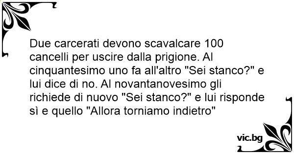 Due carcerati devono scavalcare 100 cancelli per uscire dalla prigione. Al cinquantesimo uno fa all'altro "Sei stanco?" e lui dice di no. Al novantanovesimo gli richiede di nuovo "Sei stanco?" e lui risponde sì e quello "Allora torniamo indietro"