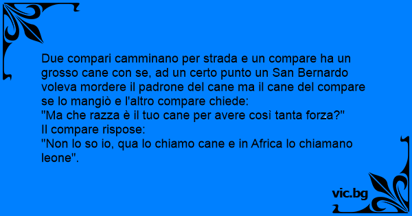 Due compari camminano per strada e un compare ha un grosso cane соn se, ad un certo punto un San Bernardo voleva mordere il padrone del cane ma il cane del compare se lo mangiò e l'altro compare chiede: "Ma che razza è il tuo cane per avere così tanta forza?" Il compare rispose: "Non lo so io, qua lo chiamo cane e in Africa lo chiamano leone".