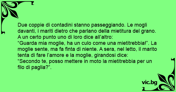 “Guarda mia moglie, ha un сulо come una mietitrebbia!”. La moglie sente, ma fa finta di niente. A sera, nel letto, il marito tenta di fare l’amore e la moglie, girandosi dice: