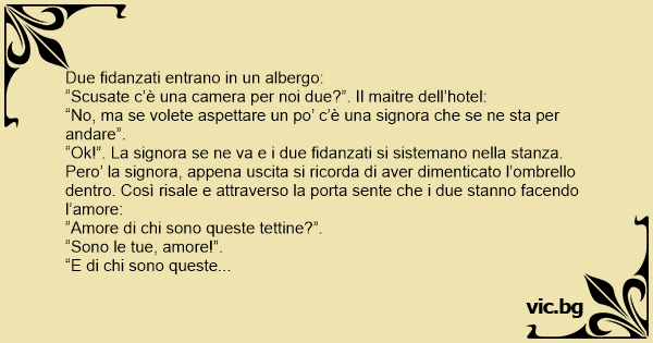 “Ok!”. La signora se ne va e i due fidanzati si sistemano nella stanza. Pero’ la signora, appena uscita si ricorda di aver dimenticato l’ombrello dentro. Così risale e attraverso la porta sente che i due stanno facendo l’amore: