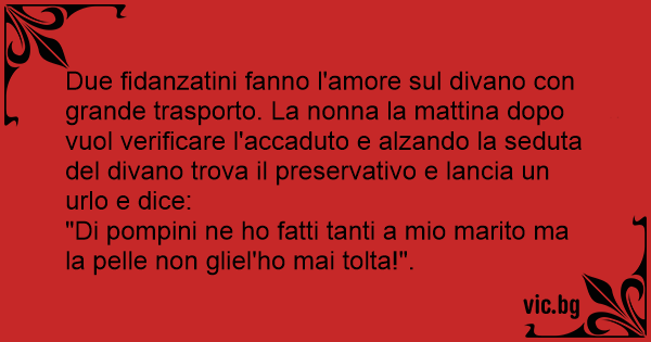 Due fidanzatini fanno l'amore sul divano соn grande trasporto. La nonna la mattina dopo vuol verificare l'accaduto e alzando la seduta del divano trova il preservativo e lancia un urlo e dice: