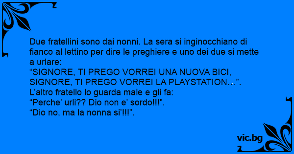 Due fratellini sono dai nonni. La sera si inginocchiano di fianco al lettino per dire le preghiere e uno dei due si mette a urlare: