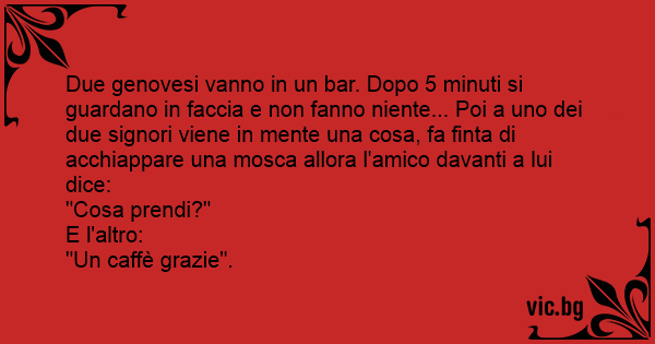 Due genovesi vanno in un bar. Dopo 5 minuti si guardano in faccia e non fanno niente... Poi a uno dei due signori viene in mente una cosa, fa finta di acchiappare una mosca allora l'amico davanti a lui dice:
