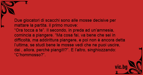 “Ora tocca a te”. Il secondo, in preda ad un’amnesia, comincia a piangere. “Ma cosa fai, va bene che sei in difficoltà, ma addirittura piangere, e poi non è ancora detta l’ultima, se studi bene le mosse vedi che ne puoi uscire, dai , allora, perchè piangi!!?”. E l’altro, singhiozzando: