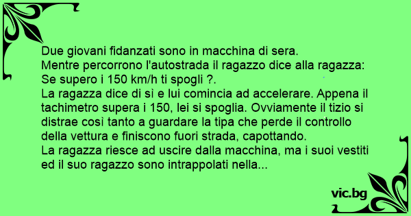 La ragazza dice di sì e lui comincia ad accelerare. Appena il tachimetro supera i 150, lei si spoglia. Ovviamente il tizio si distrae così tanto a guardare la tipa che perde il controllo della vettura e finiscono fuori strada, capottando.