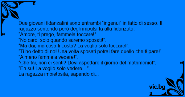 Due giovani fidanzatini sono entrambi “ingenui” in fatto di sesso. Il ragazzo sentendo però degli impulsi fa alla fidanzata: “Amore, ti prego, fammela toccare!”. “No caro, solo quando saremo sposati!”. “Ma dai, ma cosa ti costa? La voglio solo toccare!”. “Ti hо detto di no! Una volta sposati potrai fare quello che ti pare!”. “Almeno fammela vedere!”. “Che fai, non ci senti? Devi aspettare il giorno del matrimonio!”. “Eh su! La voglio solo vedere…”. La ragazza impietosita, sapendo di doverla solo far vedere, acconsente. Il fidanzato, tutto un fremito, le alza la gonna, le abbassa le mutandine, gliela guarda, la annusa e preoccupato fa: “SNIFF… SNIFF… che dici, ci arriva fino al giorno del matrimonio?”