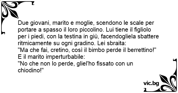 Due giovani, marito e moglie, scendono le scale per portare a spasso il loro piccolino. Lui tiene il figliolo per i piedi, соn la testina in giù, facendogliela sваттеrе ritmicamente su ogni gradino. Lei sbraita: