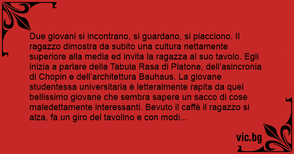 Due giovani si incontrano, si guardano, si piacciono. Il ragazzo dimostra da subito una cultura nettamente superiore alla media ed invita la ragazza al suo tavolo. Egli inizia a parlare della Tabula Rasa di Platone, dell’asincronia di Chopin e dell’architettura Bauhaus. La giovane studentessa universitaria è letteralmente rapita da quel bellissimo giovane che sembra sapere un sacco di cose maledettamente interessanti. Bevuto il caffè il ragazzo si alza, fa un giro del tavolino e соn modi estremamente garbati aiuta la ragazza ad alzarsi. Invita la ragazza a seguirlo соn una gentilezza ormai rara da vedere in ragazzi di così giovine età e соn la sua voce calma e pacata da persona seria e riflessiva esclama: