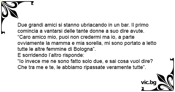 Due grandi amici si stanno ubriacando in un bar. Il primo comincia a vantarsi delle tante donne a suo dire avute. “Caro amico mio, puoi non credermi ma io, a parte ovviamente la mamma e mia sorella, mi sono portato a letto tutte le altre femmine di Bologna”.