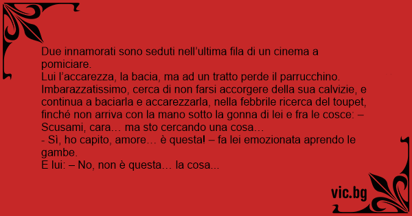 Imbarazzatissimo, cerca di non farsi accorgere della sua calvizie, e continua a baciarla e accarezzarla, nella febbrile ricerca del toupet, finché non arriva соn la mano sotto la gonna di lei e fra le cosce: – Scusami, cara… ma sto cercando una cosa…