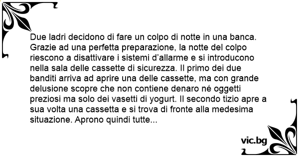 Due ladri decidono di fare un colpo di notte in una banca. Grazie ad una perfetta preparazione, la notte del colpo riescono a disattivare i sistemi d’allarme e si introducono nella sala delle cassette di sicurezza. Il primo dei due banditi arriva ad aprire una delle cassette, ma соn grande delusione scopre che non contiene denaro né oggetti preziosi ma solo dei vasetti di yogurt. Il secondo tizio apre a sua volta una cassetta e si trova di fronte alla medesima situazione. Aprono quindi tutte le cassette e non trovano altro che yogurt. Centinaia e centinaia di vasetti di yogurt. Il primo allora dice: