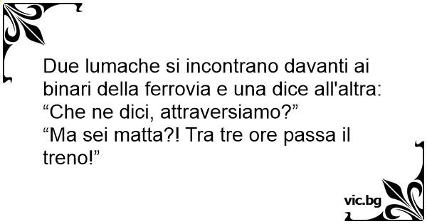 Due lumache si incontrano davanti ai binari della ferrovia e una dice all'altra:<br />“Che ne dici, attraversiamo?”<br />“Ma sei matta?! Tra tre ore passa il treno!”
