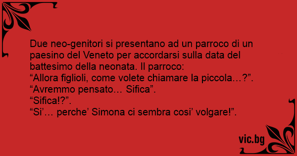 Due neo-genitori si presentano ad un parroco di un paesino del Veneto per accordarsi sulla data del battesimo della neonata. Il parroco: