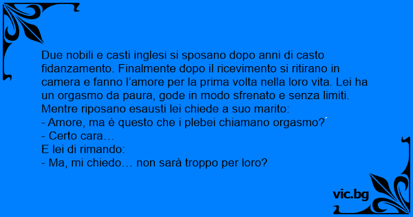 Due nobili e casti inglesi si sposano dopo anni di casto fidanzamento. Finalmente dopo il ricevimento si ritirano in camera e fanno l’amore per la prima volta nella loro vita. Lei ha un orgasmo da paura, gode in modo sfrenato e senza limiti.