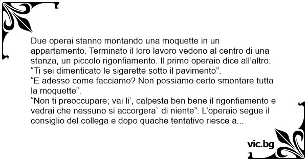 “Non ti preoccupare; vai li’, calpesta ben bene il rigonfiamento e vedrai che nessuno si accorgera` di niente”. L’operaio segue il consiglio del collega e dopo quache tentativo riesce a ripianare il bozzo. Arriva la padrona di casa, si congratula per l`ottimo lavoro e consegna un pacchetto di sigarette agli operai: