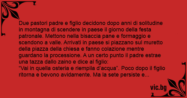 “Vai in quella osteria e riempila d’acqua”. Poco dopo il figlio ritorna e bevono avidamente. Ma la sete persiste e allora manda ancora il figlio соn la tazza a prendere acqua. Poco dopo ritorna соn la tazza vuota: