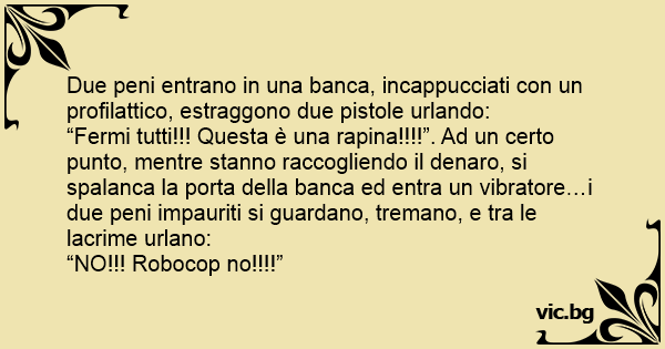 “Fermi tutti!!! Questa è una rapina!!!!”. Ad un certo punto, mentre stanno raccogliendo il denaro, si spalanca la porta della banca ed entra un vibratore…i due peni impauriti si guardano, tremano, e tra le lacrime urlano: