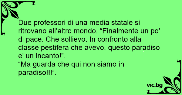Due professori di una media statale si ritrovano all’altro mondo. “Finalmente un po’ di pace. Che sollievo. In confronto alla classe pestifera che avevo, questo paradiso e’ un incanto!”.