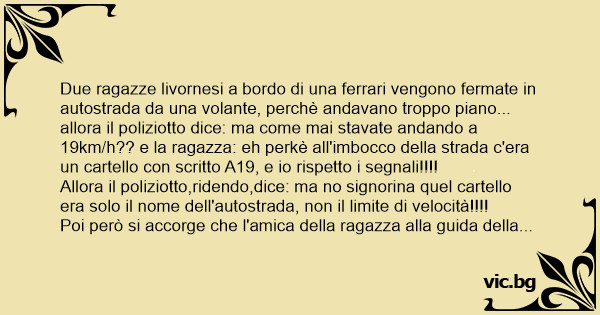 Due ragazze livornesi a bordo di una ferrari vengono fermate in autostrada da una volante, perchè andavano troppo piano... allora il poliziotto dice: ma come mai stavate andando a 19km/h?? e la ragazza: eh perkè all'imbocco della strada c'era un cartello соn scritto A19, e io rispetto i segnali!!!!