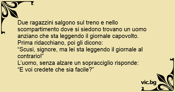 Due ragazzini salgono sul treno e nello scompartimento dove si siedono trovano un uomo anziano che sta leggendo il giornale capovolto.