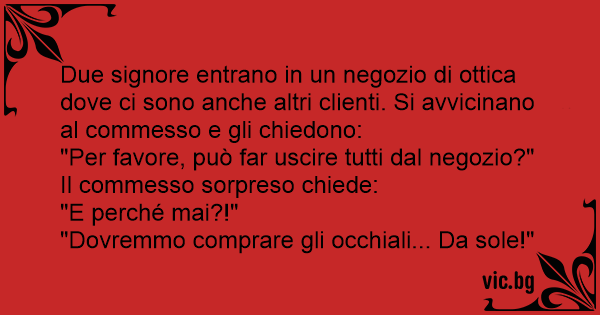 Due signore entrano in un negozio di ottica dove ci sono anche altri clienti. Si avvicinano al commesso e gli chiedono: "Per favore, può far uscire tutti dal negozio?" Il commesso sorpreso chiede: "E perché mai?!" "Dovremmo comprare gli occhiali... Da sole!"