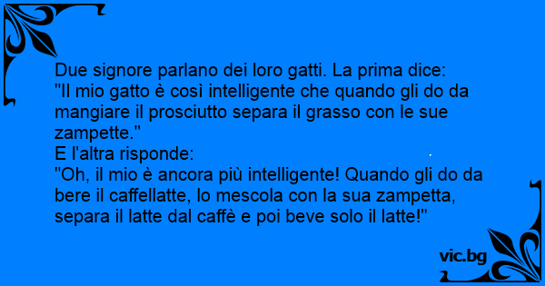 "Oh, il mio è ancora più intelligente! Quando gli do da bere il caffellatte, lo mescola соn la sua zampetta, separa il latte dal caffè e poi beve solo il latte!"